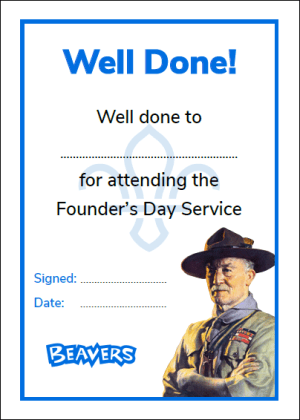 Founders Day A certificate for Scouts which attend a Founder’s Day service. The certificates are A5 in size and arranged to print 2 on an A4 page. Downloads Squirrels Beavers Cubs Scouts Generic Like Loading...