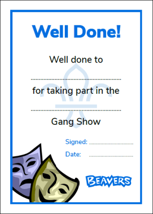 Gang Show A certificate for Scouts which take part in a Gang Show. The certificates are A5 in size and arranged to print 2 on an A4 page. Downloads Squirrels Beavers Cubs Scouts Generic Like Loading...