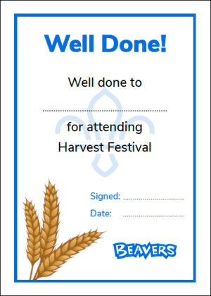 Harvest A certificate for Scouts which attend a Harvest Service. The certificates are A5 in size and arranged to print 2 on an A4 page. Downloads Squirrels Beavers Cubs Scouts Generic Like Loading...
