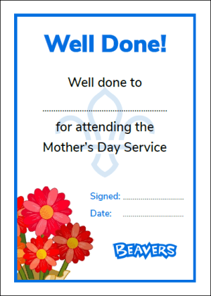 Mother’s Day A certificate for Scouts which attend a Mother’s Day Service. The certificates are A5 in size and arranged to print 2 on an A4 page. Downloads Squirrels Beavers Cubs Scouts Generic Like Loading...