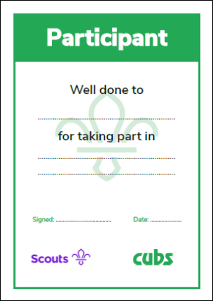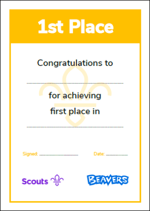 Hosting a competition, quiz or sports event? The links below provide certificates for 1st, 2nd and 3rd place with spaces to fill in the name of the event. In addition there is a ‘Participant’ certificate for Scouts/Groups who took part but didn’t quite make the top 3.