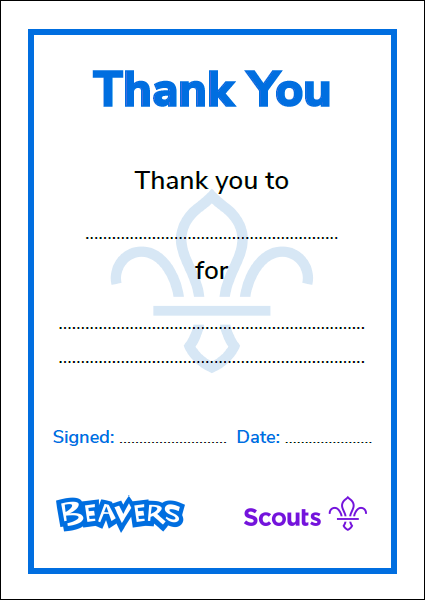 Below are a selection of cards and certificates that can be used to thank someone for something they have done. This could be a Scout within your group who has done something worth rewarding, or an person/team/organisation which helped with an activity or event.