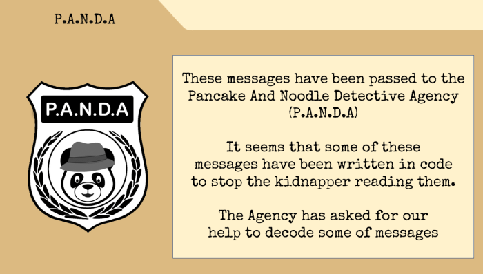 These messages have been passed to the “Pancake And Noodle Detective Agency” (P.A.N.D.A for short), who have asked the group to help decode the messages to rescue Baloo.
